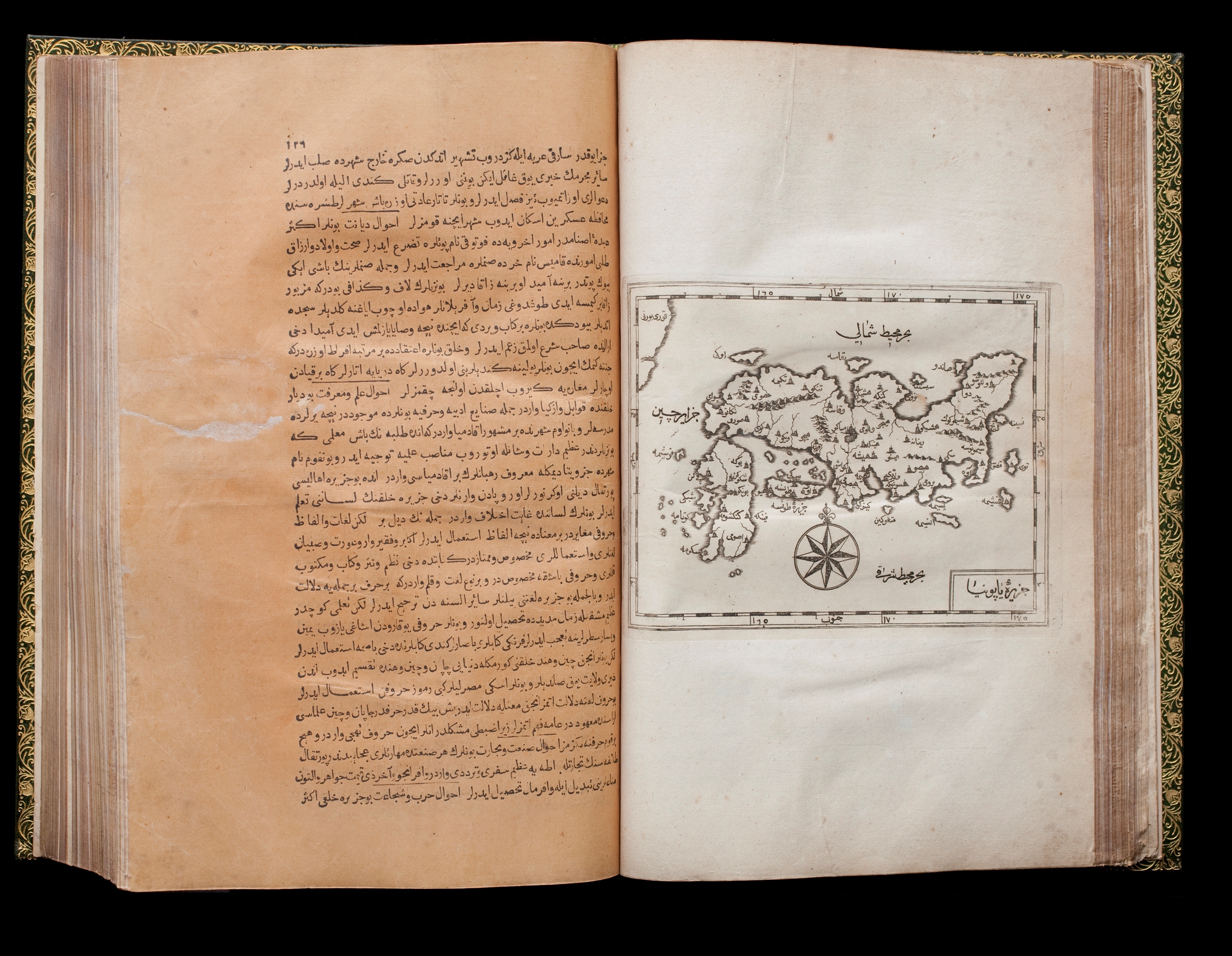 オスマン帝国時代のトルコで初めて作られたアラビア文字の活版印刷本の1つで、世界の地理について記しています。日本(ヤポンヤ島)に関する記述に始まり、地図も掲載されています。