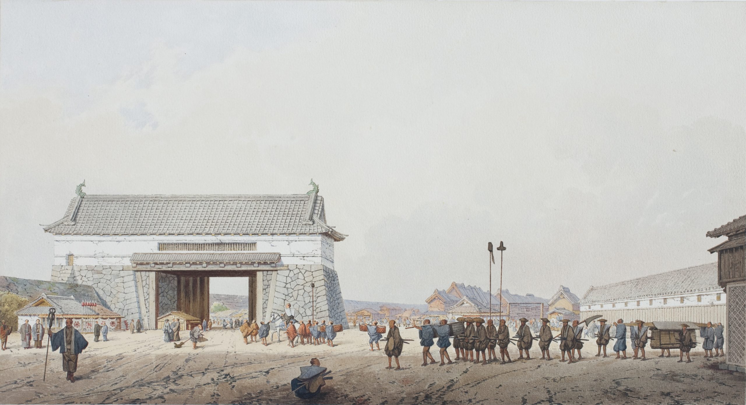 1860年に日本を訪れ、日本とプロイセン(現ドイツ)の修好通商条約を締結したオイレンブルク使節団が作成した報告書の一部です。図版60枚のうち30枚が日本に関するもので、江戸城とその周辺、横浜、長崎などが描かれています。風景だけではなく、日本庭園、寺社、道端の店など、日常の情景も描写しています。また、原画とは別に、それぞれの絵についての詳細な説明も付いています。