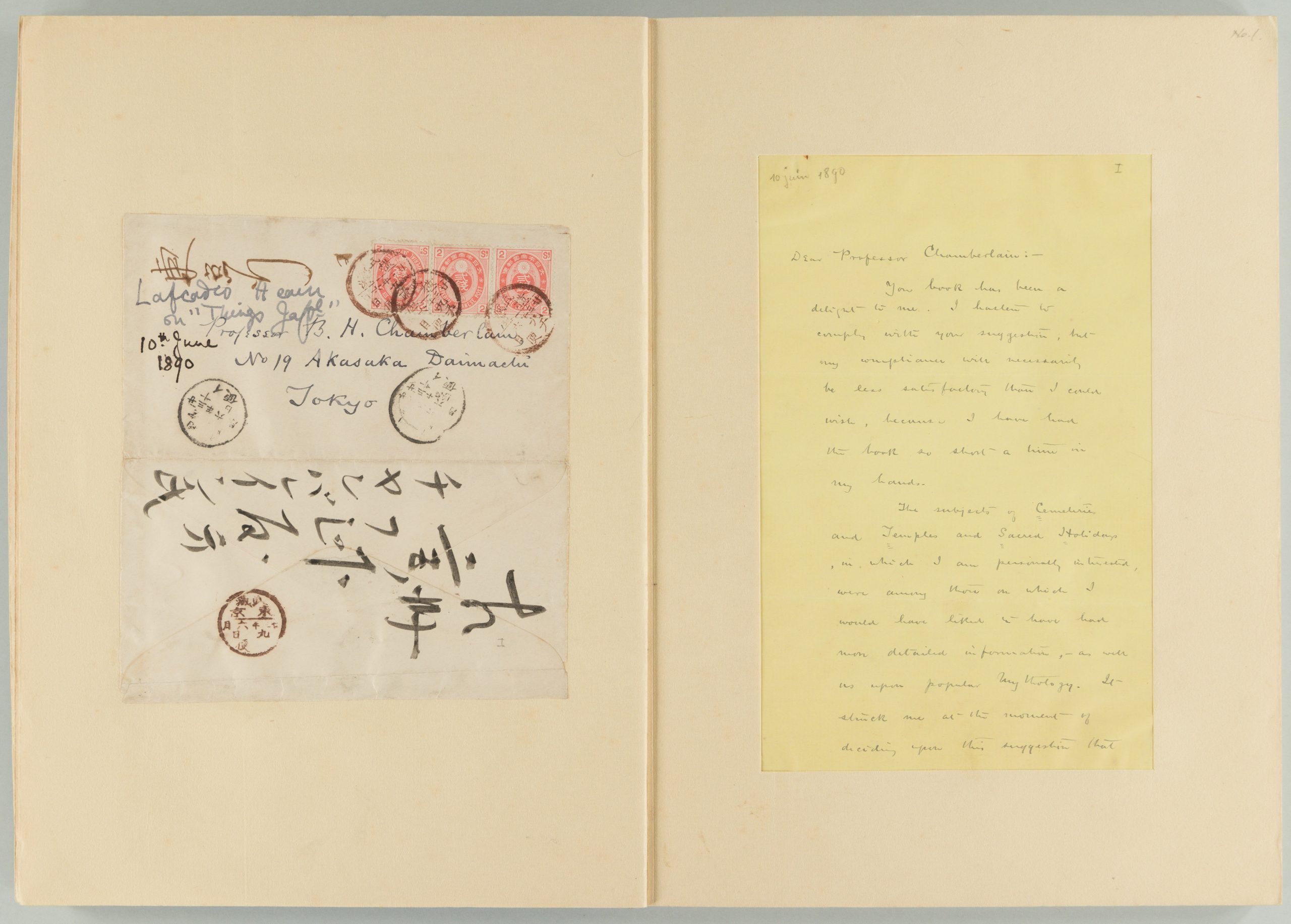 ラフカディオ・ハーン(小泉八雲)は、明治時代に活躍したギリシャ出身の新聞記者・日本研究者・小説家です。一方、イギリス出身のチェンバレンは、「君が代」や『古事記』の英訳で知られる当時最も著名な日本研究者で、外国人初の帝国大学(東京大学)名誉教授となった人物です。二人には親交があり、東洋文庫はハーン来日後の1890年以降の複数年にわたって両者が交わした手紙を所蔵しています。