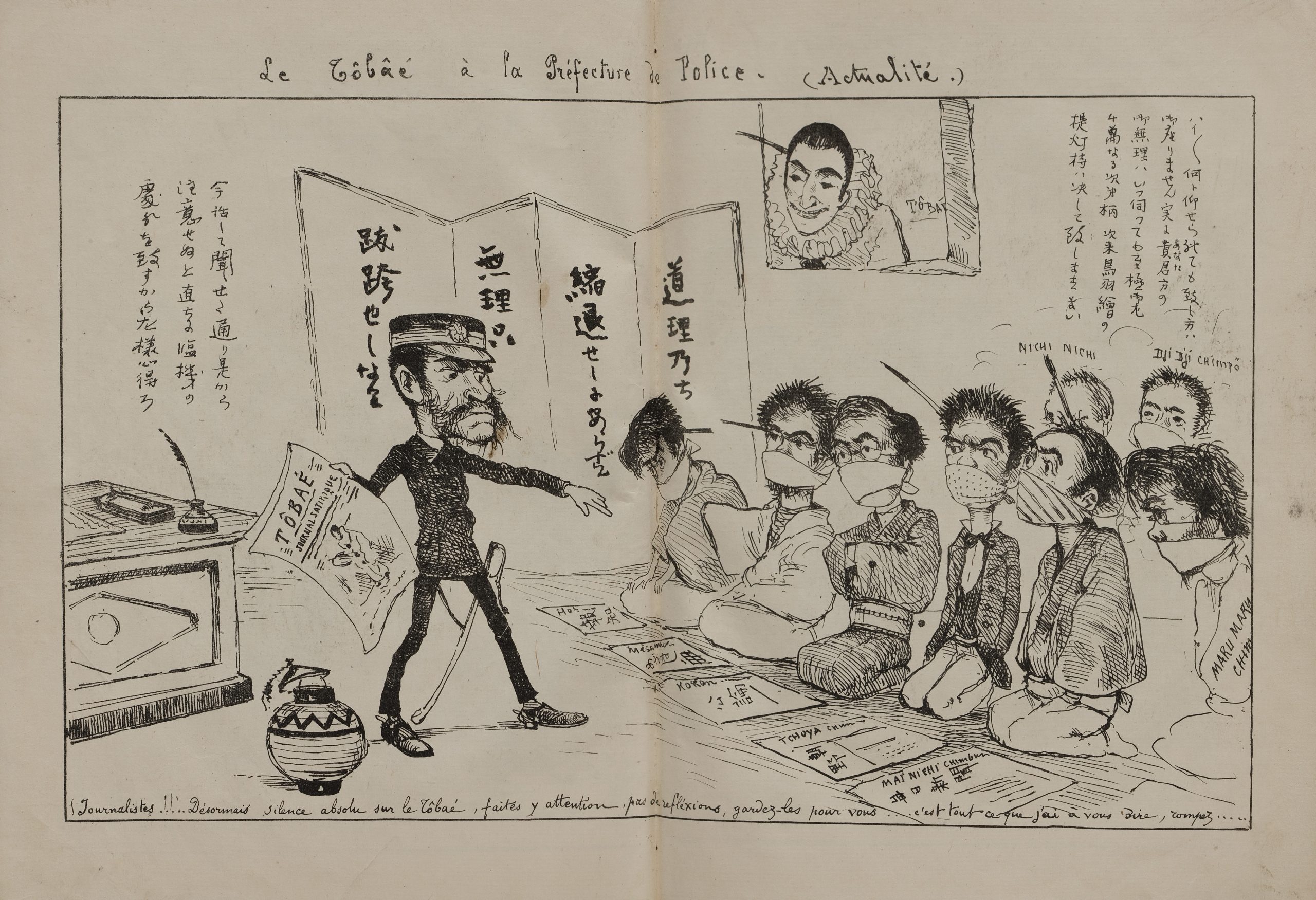 フランス出身の画家・漫画家のビゴーが描いた風刺画です。ビゴーは、当時ヨーロッパで流行していた「日本趣味(ジャポニズム)」の影響を受け、日本美術を研究するため1882年頃に来日しました。1887年に雑誌『トバエ』を刊行し、日本の政治や社会を題材とする風刺画を多数描きました。その作品には、自国の伝統ある文化を忘れて西洋文化を追い求める日本人の姿に落胆し、失われつつある古き良き日本文化を惜しむ気持ちが込められています。
